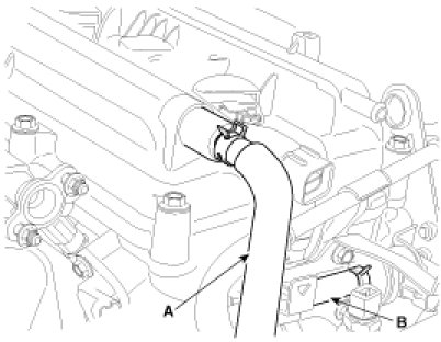 13. Disconnect the positive crankcase ventilation(PCV) hose(A) and PCSV hose(B).