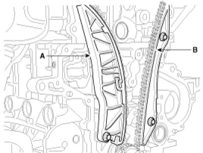 22. Remove the timing chain tensioner arm(A) and guide(B).