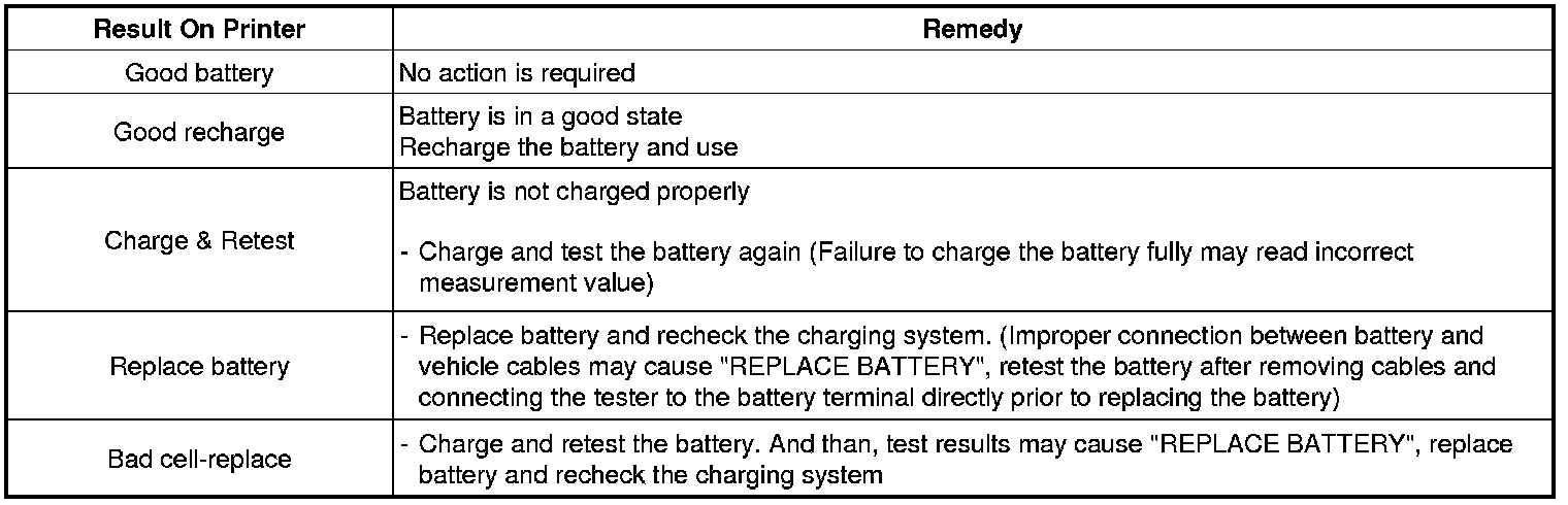 A relevant action must be given according to the test results by referring to the battery test results as shown in the table below.