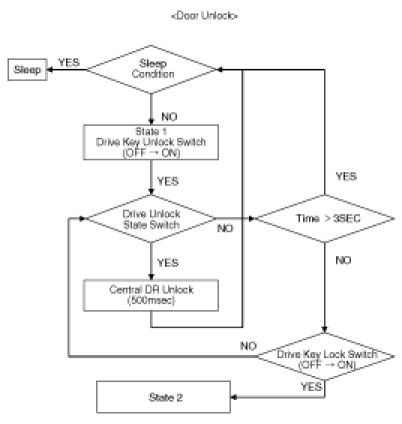 (2) Perform Unlock Relay output for 1s after 0.5s when the condition becomes to be KEY IN = ON& Driver Door open Switch = OPEN & Driver Door Unlock Switch = LOCK(Regions for North America).