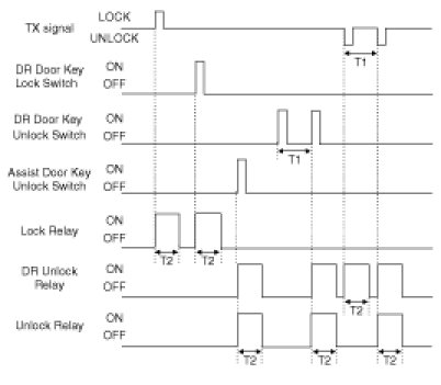(3) Turn Driver Unlock Relay output ON during T2 when receiving TUNLOCK signal. However, turn Driver Unlock Relay, Unlock Relay (Central Unlock) output duting T2 if TUNLOCK is received within T1.