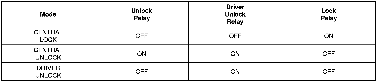 (8) Output Driver Unlock Relay once only for 1s when Driver Door open Switch is closed within 0.5s since Driver Door Unlock Switch is changed from UNLOCK to LOCK during KEY IN = ON(North America SPEC ONLY).