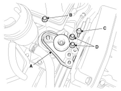 (2) Remove the bolt (C) and nuts (B, D), and then remove the engine mount bracket (A).
