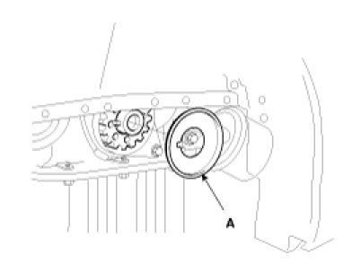 11. Remove the crankshaft pulley bolt (B) and crankshaft pulley (A).