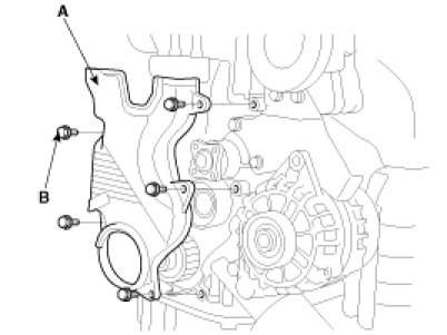 14. Install the timing belt lower cover (A) with 5 bolts (B).
