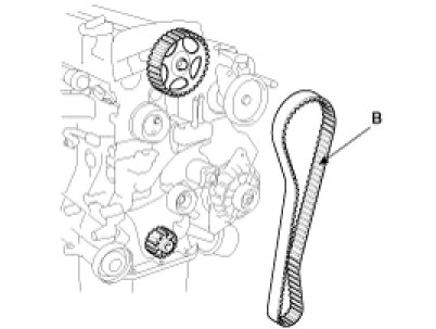 14. Remove the timing belt tensioner (A) and timing belt (B).