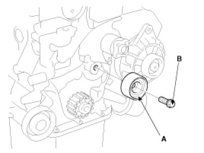 5. Install the idler pulley (A) and tighten the bolt (B) to the specified torque.
