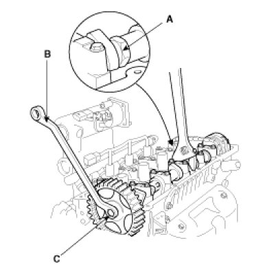 (1) Hold the hexagonal head wrench (A) portion of the camshaft with a wrench (B), and remove the bolt and camshaft sprocket (C).