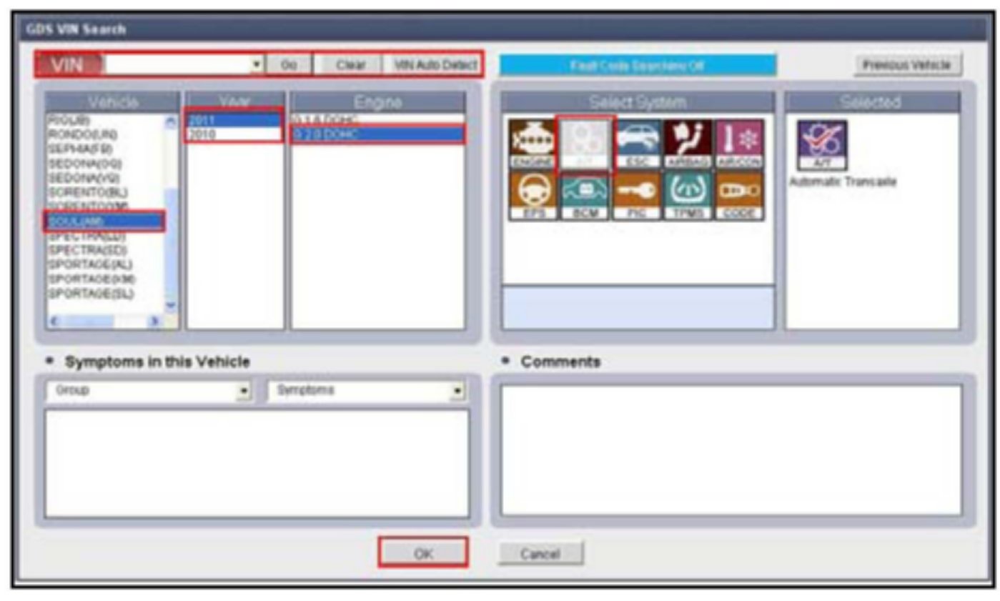 Enter the vehicle information by pressing the VIN Auto Detect button, entering the vehicle's VIN or selecting the vehicle model, model year, engine/fuel type and A/T as the system; then click OK.