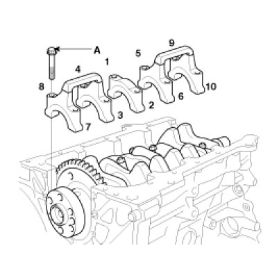 (2) Install and uniformly tighten the 10 bearing cap bolts(A), in several passes, in the sequence shown.