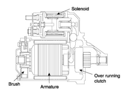 The contacts close and the starter motor cranks. In order to prevent damage caused by excessive rotation of the starter armature when the engine starts, the pinion gear clutch disengages.
