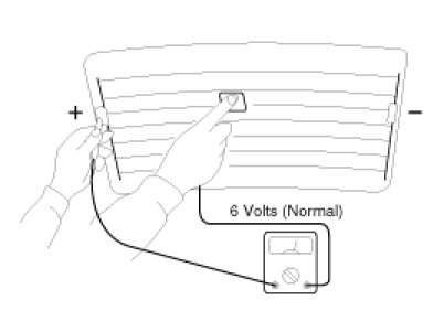 1. Turn on the defogger switch and use a voltmeter to measure the voltage of each heater line at the glass center point. If a voltage of approximately 6V is indicated by the voltmeter, the heater line of the rear window is considered satisfactory.