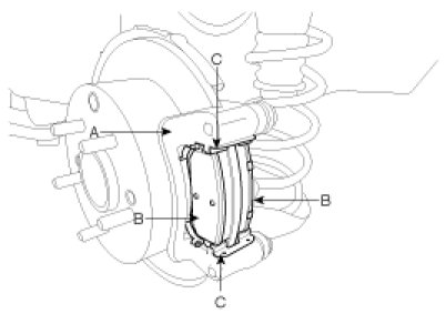 2. Replace pad shim, pad retainers (C) and brake pads (B) in the caliper bracket (A).