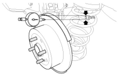 1. Place a dial gauge about 5mm (0.2 in.) from the outer circumference of the brake disc, and measure the runout of the disc.