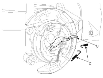 2. Install the shoe hold down pin(C) and the spring(D) by pushing the retainer spring (D) and turning the pins.