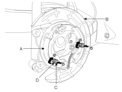 3. After installing the strut (A) and upper return spring (B), install the adjuster assembly (C) and the lower return spring (D).