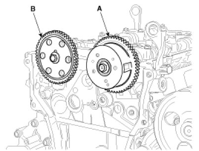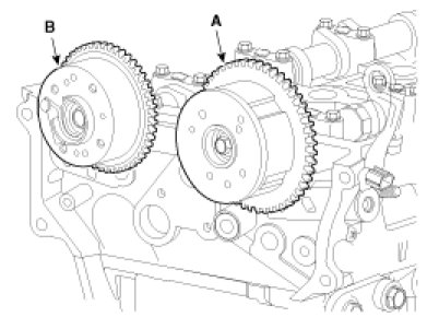 14. Remove the intake CVVT assembly (A) and exhaust CVVT sprocket or camshaft sprocket (B).