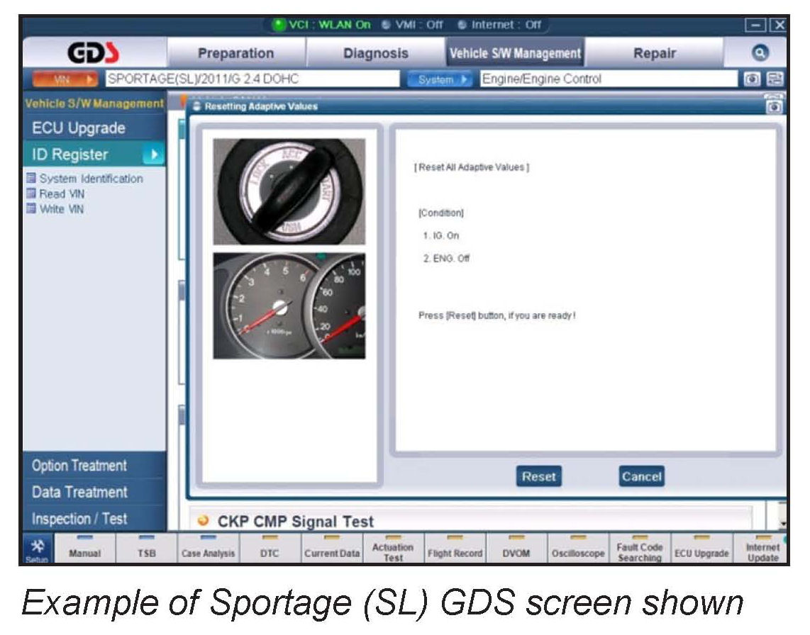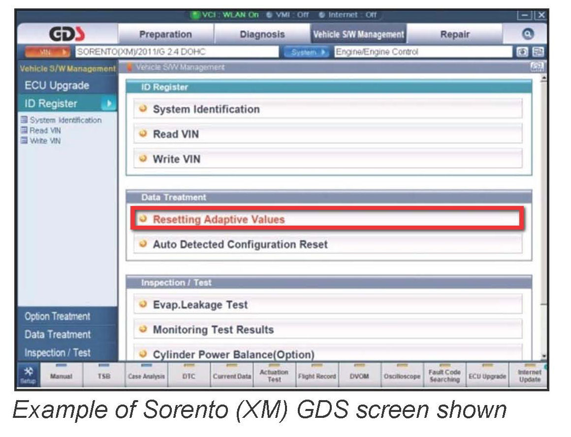 This bulletin provides the procedure to reset (erase) and relearn the Electronic Throttle Control (ETC) adaptive value (throttle valve position) on the following Kia vehicles: Rondo (UN), Forte/Forte Koup (TD), Optima (TF), Optima (MG), Sorento (XM), and Sportage (SL) with Theta-2.0/2.4L gasoline engines with ETC systems.