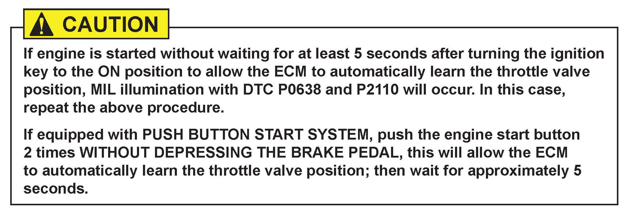 6. Wait for 5 seconds after turning ignition ON (ETC adaptive value relearn).