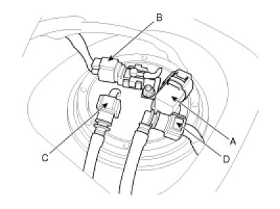 5. Disconnect the fuel feed tube quick-connector (C) and the vapor tube quick-connector (D).