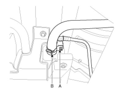 9. Disconnect the vapor tube quick-connector (A) and the vapor hose (B).