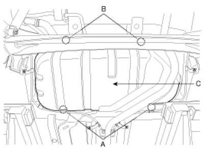 10. Remove the mounting bolts (A) and nuts (B), and then remove the fuel tank (C).