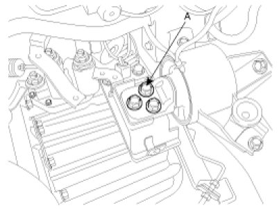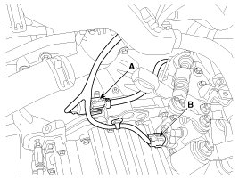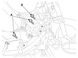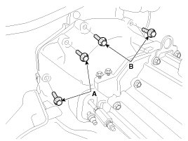 8. Remove the manual transaxle upper mounting bolt (B-2ea) and the starter motor mounting bolt (A-2ea).