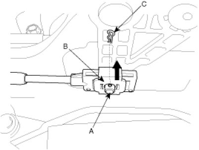 - Adjust the slide clip (B) to fit it into the select lever pin (A) and install the snap pin (C).