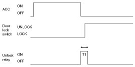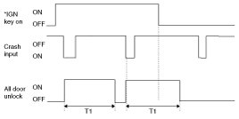 1. FOB IN ON or KEY IN ON or ACC ON or IGN1 ON or IGN2 ON state Crash Input ON signal is ON, T1 is performed for ALL DOOR UNLOCK output. (CRASH UNLOCK output)