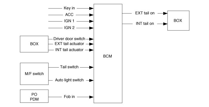 The "Tail Auto Cut" strategy ensures that Tail lamps are turned off even if a driver forgets to turn them off. When the Tail lamp is turned on by Tail lamp switch, after key insertion , and if a user removes key and opens the driver side door(or vice versa), the Tail lamps are automatically turned off. While "Tail Auto Cut" function is active, if a user turns off the Tail lamp switch or inserts key, "Tail Auto Cut" function will be deactivated and Tail lamps can be turned on.