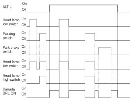 A. If alternator level is high(ALT L=On), BCM activates Canada DRL functionality and turns on the Head lamp high (CANADA DRL=On).