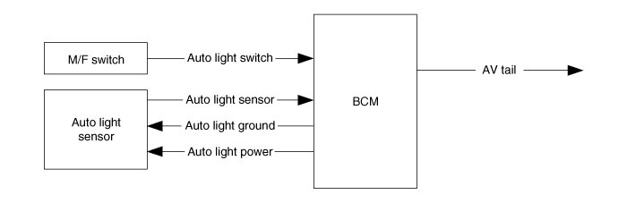 AV Tail Output Control is started In ACC, IGN,START regardless of MF switch Auto Light switch. CAN signal AV Tail is set/reset at the same time as AVTail.