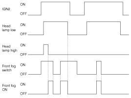 (1) In case of (IGN2=ON) & (HeadLampLow=ON) & (HeadLampHigh=Off), if Front fog lamp switch input is detected (FrontFogSW=On), Front fog lamp output (FrontFogON=On) is turned ON.