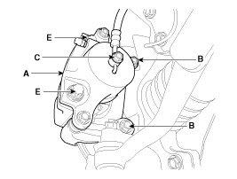2. Loosen the hose eyebolt (C) and caliper mounting bolts (B), then remove the front caliper assembly (A).