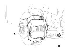 1. Loosen the guide rod bolt (B) and pivot the caliper (A) up out of the way.