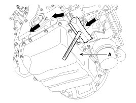 - Insert the SST between the oil pan and the ladder frame by tapping it with a plastic hammer in the direction of 1 arrow.
