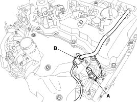 21. Install the front engine hanger (B) and then connect the PCV (Positive crankcase ventilation) hose (A).