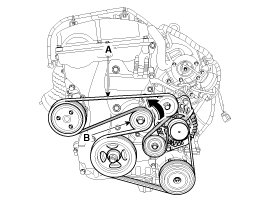 Rotate the drive belt tensioner arm (B) counterclockwise moving the tensioner pulley bolt with wrench. After putting the belt on the tensioner pulley, release the tensioner pulley slowly.