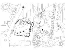 7. Install the timing chain auto tensioner (B) and remove the stopper pin (A).