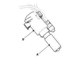 7. Separate the electric pump motor (A) from the fuel filter (B).