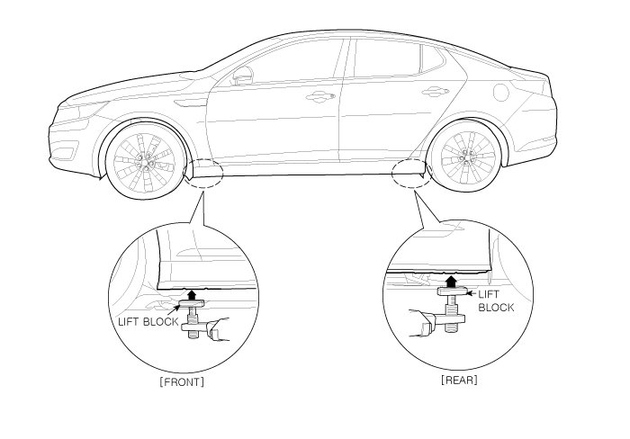 When heavy rear components such as suspension, fuel tank, spare tire, tailgate and trunk lid are to be removed, place additional weight in the luggage area before hoisting. When substantial weight is removed from the rear of the vehicle, the center of gravity may change and can cause the vehicle to tip forward on the hoist.