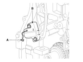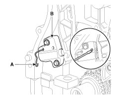 25. Release the ratchet using a thin rod. Compress the piston and then insert a stopper pin (A) into the hole on the ratchet to hold the compressed piston. Remove the timing chain tensioner (B).
