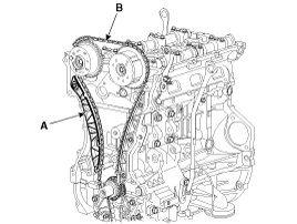 7. Install the timing chain auto tensioner (B) and remove the stopper pin (A).