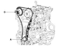 Crankshaft sprocket (A) -> Timing chain guide (B) -> Intake CVVT sprocket (C) -> Exhaust CVVT sprocket (D).