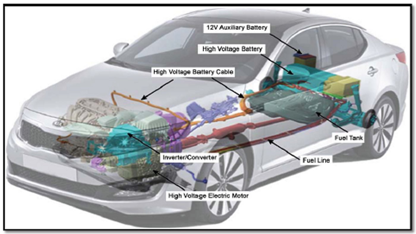 The main high voltage components in the Kia Optima Hybrid are the High Voltage Battery Pack Assembly, the Power Relay Assembly, the Battery Management System ECU, the Hybrid Power Control Unit, the Hybrid Drive Motor, the Hybrid Starter Generator, the Electric A/C Compressor, the Low DC/DC Converter, the Electric Compressor, and Power Cable.