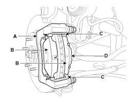 2. Replace pad shim (D), pad retainers (C) and brake pads (B) in the caliper carrier (A).