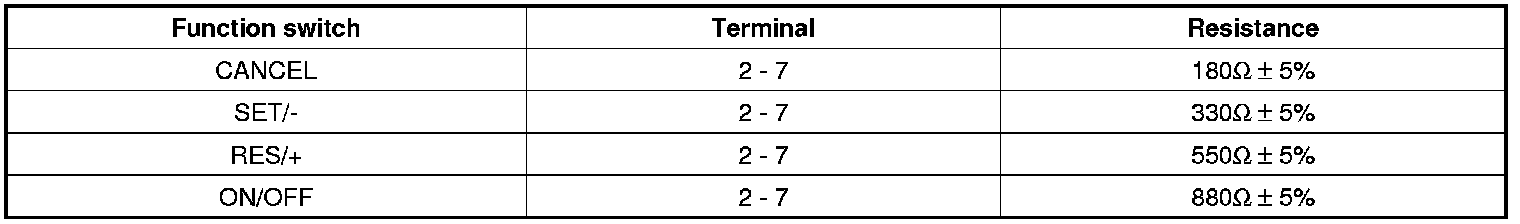 2. Measure resistance between terminals on the control switch when each function switch is ON (switch is depressed).