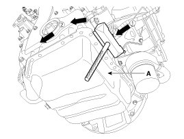 - Insert the SST between the oil pan and the ladder frame by tapping it with a plastic hammer in the direction of 1 arrow.