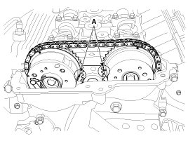 (2) Mark the timing chains (A) on the timing marks of the CVVT sprockets.