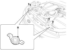 6. Loosen the front impact sensor mounting nut (B) and remove the front impact sensor.